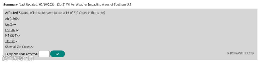UPS也发布了受暴风雪影响的五个州的邮政编码。不过,联邦快递和UPS在通知中表明他们已经制定了应急计划。