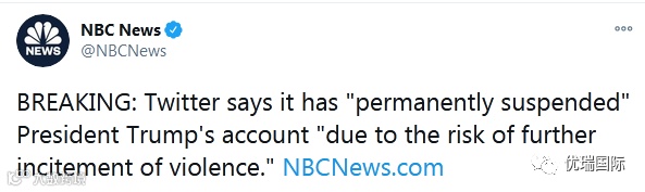 美国全国广播公司刚刚消息,推特公司称:“由于存在进一步煽动暴力行为的风险“,已‘永久封停’特朗普推特帐号。”