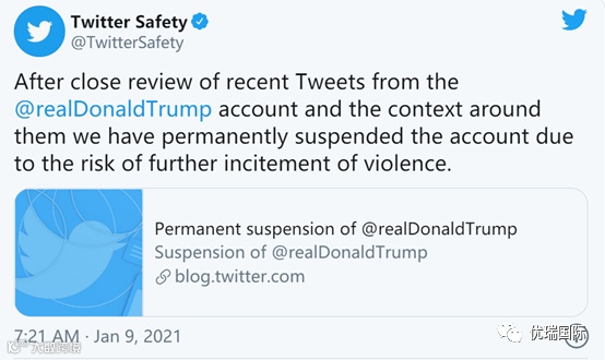 推特安全账户当地时间8日晚发文称:“在仔细审查特朗普账户最近发布的推文以及这些推文的背景后, 鉴于有进一步煽动暴力的危险,我们已永久停用该帐户。”