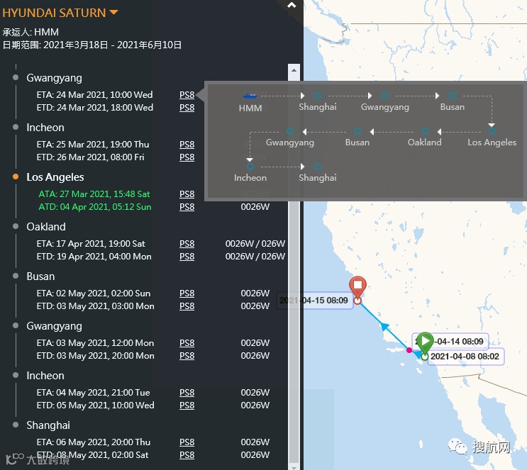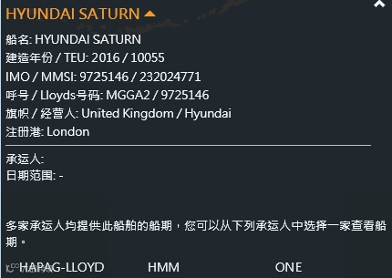 大船期资料显示,“Hyundai Saturn”轮运力为10055TEU,服务于南太平洋PS8航线,共舱的还有同联盟的船司。