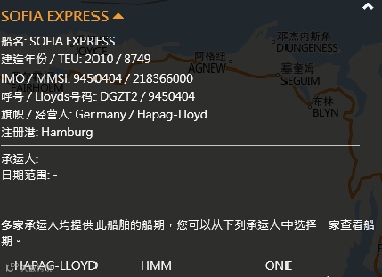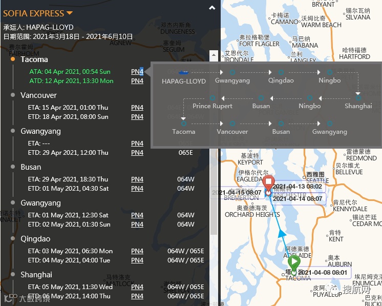 大船期资料显示,“Sofia Express”轮经营人为Hapag-Lloyd,运力为8749TEU,服务于北太平洋PN4航线,挂靠青岛、宁波、上海等国内港口,共舱的还有同联盟的船司:HMM、ONE、YANG MING。