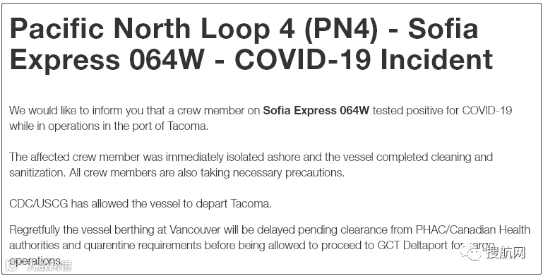 据悉,美国疾控中心CDC / USCG已允许该船离开塔科马。然而,停靠在温哥华的船只将在获得PHAC/加拿大卫生当局的许可和检疫要求后,然后才允许前往GCT Deltaport进行货物作业,预计会对该轮的船期有一定影响。