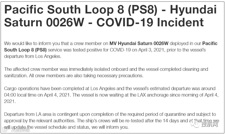 如下文公告,同样是服务于跨太平洋航线的“Hyundai Saturn”轮,船只在即将该离开洛杉矶之前,一名船员于2021年4月3日被检测出COVID-19阳性。