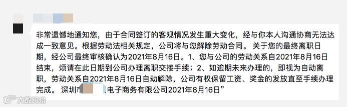 从群里曝光的信息看,裁员的公司是大卖旗下的子公司,由于“客观情况发生重大变化”,与部分员工沟通协商无法达成一致,于是解除了劳动合同。要求部分员工于8月16日离职,逾期将被视为自动离职。
