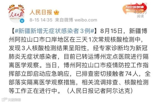 据央视8月15日报道,新疆博州阿拉山口市口岸地区在三天1次常规核酸检测中,发现3人核酸检测结果呈阳性,经专家诊断均为新冠肺炎无症状感染者,目前已转运博州定点医院进行隔离医学观察。