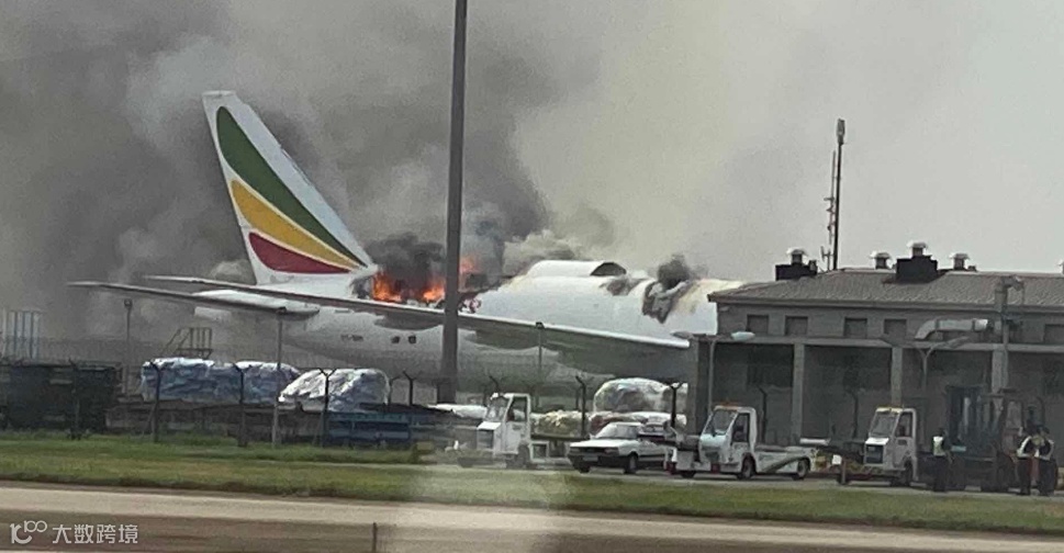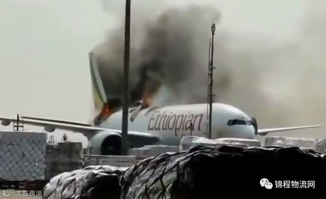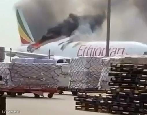 根据现场曝光的视频及图片我们可以看到,飞机周边堆满货物,这架埃塞俄比亚航空的飞机尾部突发火灾,顶部已经被熊熊大火烧了个大洞,飞机损毁严重。