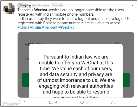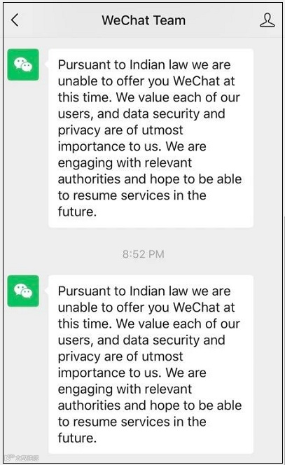 微信在给用户的通知中称,“根据印度法律,我们目前无法为您提供微信服务。我们重视每一位用户,数据安全和隐私对我们来说是最重要的。我们正在与相关部门接触,希望未来能够恢复服务。”