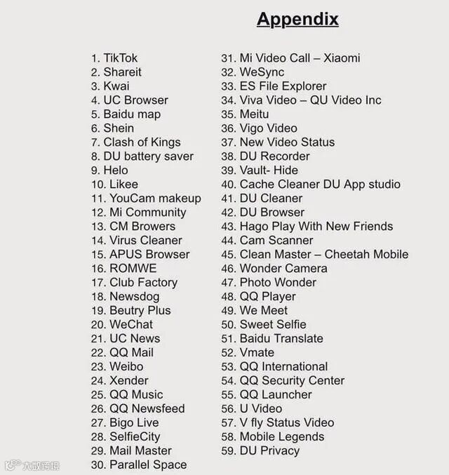 此前,6月29日晚,印度政府突然宣布禁止在印使用包括抖音海外版(TikTok)、微信(WeChat)、微博、QQ邮箱、UC浏览器等在内的59款“中国APP”,理由是这些APP会危害印度“主权完整、国家安全和公共秩序”。