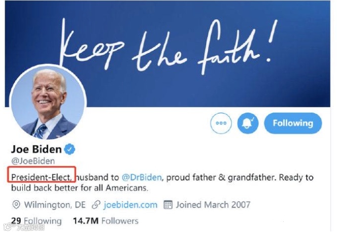 因此,本次大选的结果基本上已成定局。拜登在其推特上的认证也已经改为President-Elect(当选总统)。