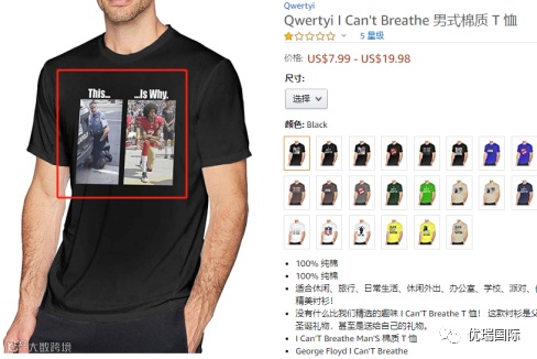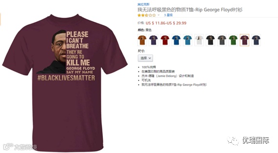 据英国BBC,9日报道在非裔男子弗洛伊德的葬礼在休斯敦举行的同一天,亚马逊上架了多款印有弗洛伊德死前被警察暴力跪脖锁喉的现场印花,引起了内部亚马逊员工的举报。