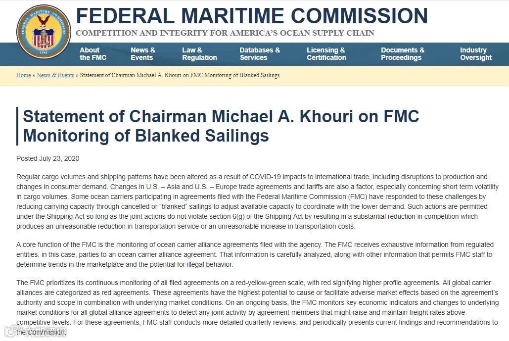 与此同时,美国联邦海事委员会(FMC)也在官网发文称,将监控船公司的停航计划。