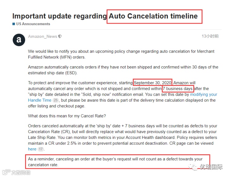 昨天,亚马逊发布一封标题为“Important update regarding Auto Cancelation timeline”的邮件通知,原文如下: