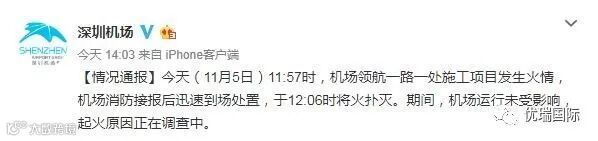机场方面通报:今天(11月5日)11:57时,机场领航一路一处施工项目发生火情,机场消防接报后迅速到场处置,于12:06时将火扑灭。期间,机场运行未受影响,起火原因正在调查中。
