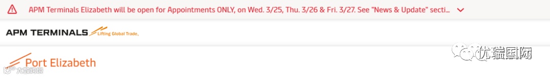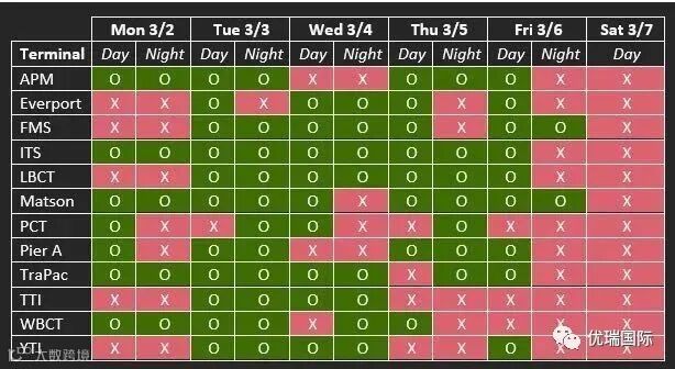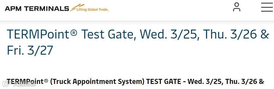 可在该码头的TERMPoint® (Truck Appointment System)系统预约,3月25日--27日任何未预约的拖车将被拒收。
