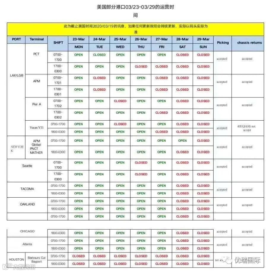 早在美国疫情大爆发之前,3月4日凌晨,洛杉矶集装箱码头已公示,受疫情影响,所有码头还箱将实行错时服务。错时关闭还箱业务!预计其它部分港口也会跟进类似应对措施。