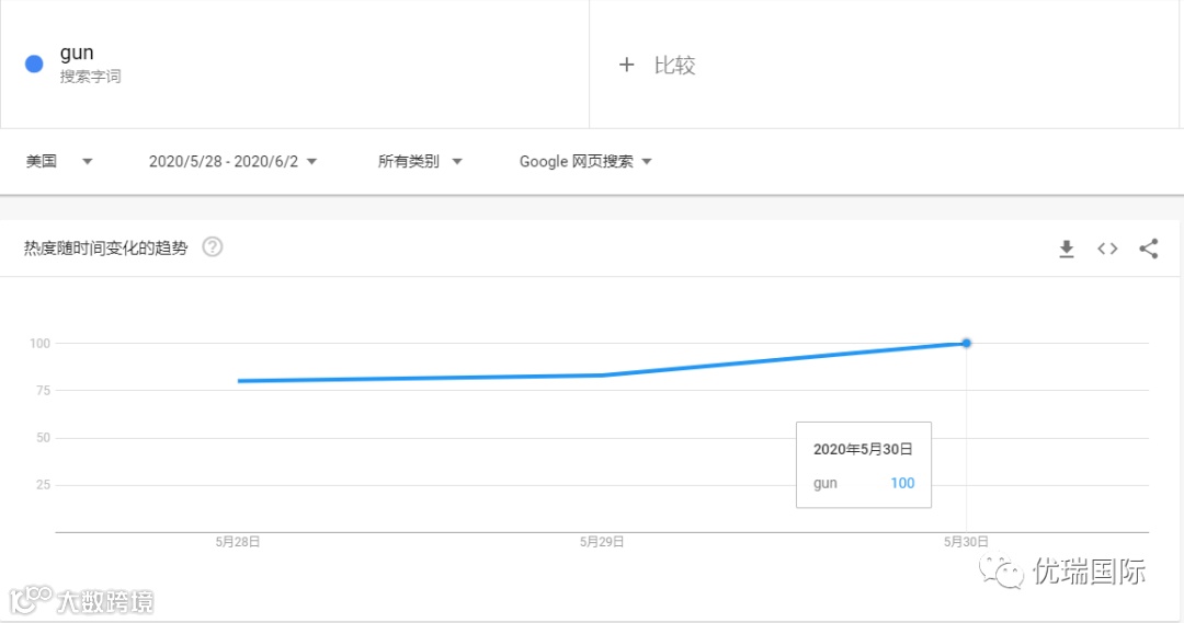 通过谷歌趋势搜索显示,从5月28日至5月30日,在美国,“gun(枪)”的搜索热度持续飙升,在5月30日的搜索热度达到了最高。