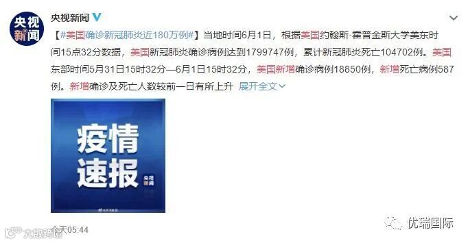 下面这组数据似乎验证了世卫组织以及卫生专家的担忧不无道理,据了解,美国东部时间5月31日15时32分—6月1日15时32分,美国新增确诊病例18850例,新增死亡病例587例。新增确诊及死亡人数较前一日有所上升。