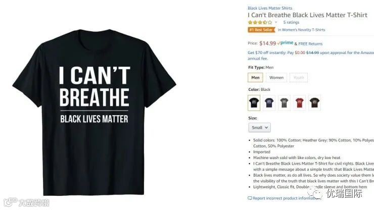 据外媒报道,在亚马逊平台上,两件“我喘不过气来”的T恤衫跻身十大畅销商品之列。电子商务研究公司Marketplace Pulse的负责人Juozas Kaziukenas说,一件Black Lives Matter衬衫在亚马逊最畅销的服装中排名第60位,比上周五显着上升,当时这件产品并没有出现在该类别前1000名的畅销产品中。