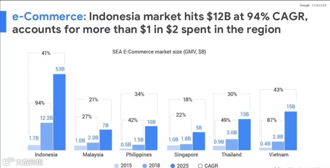 据谷歌和淡马锡联合研究指出,到2025年,东南亚互联网经济价值预计将超过2400亿美元,比2018年的首次预测高出400亿美元。届时,东南亚电商市场价值预计将达1020亿美元,占该地区互联网经济总价值的40%以上。