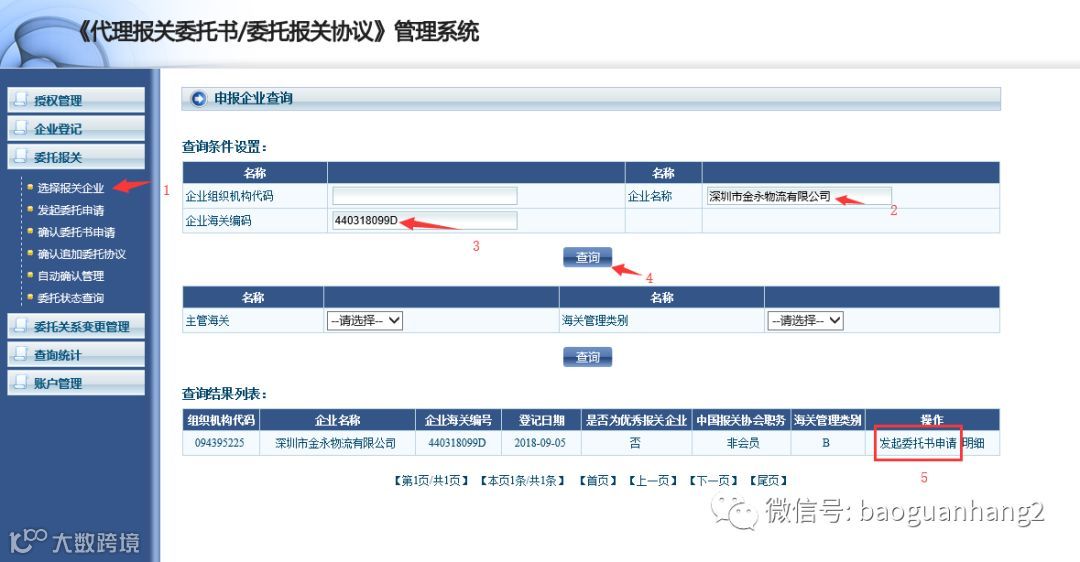 第三步:选择报关企业,输入企业名称及海关10位数编码,点击查询。(如下图步骤)