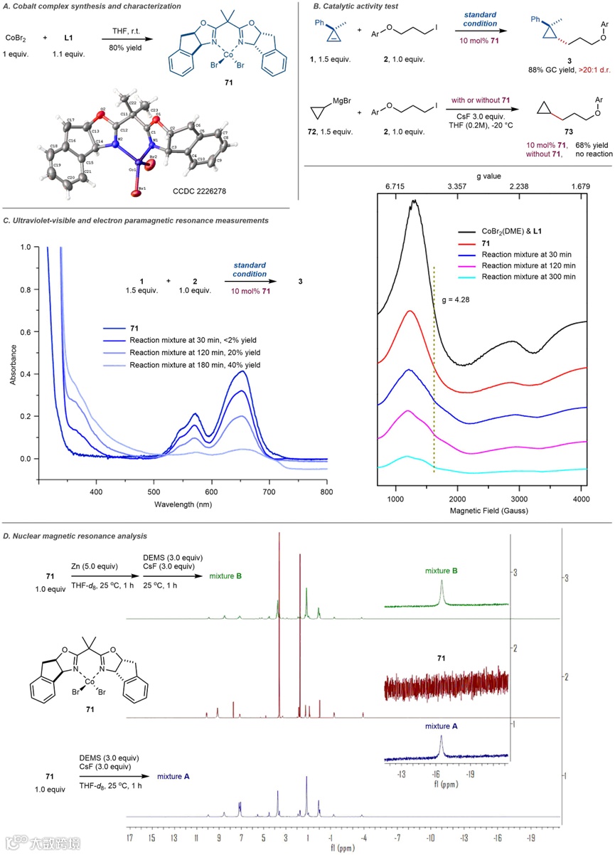 自由基钟和自由基捕获实验表明,该反应可能经历烷基卤化物自由基活化过程。氘代实验表明,钴-氢物种对烯烃顺式插入且不可逆。催化剂络合物合成及相关谱学实验表明,反应过程中可能产生Co(I)H物种。