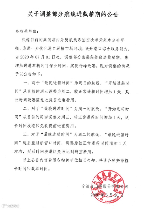 三、对于“最晚进箱时间”为周二的航线,“最晚进箱时间”延后至船舶窗口时间,调整后较正常进箱时间增加1天左右,延后时间段港区免收迟到进重费用。