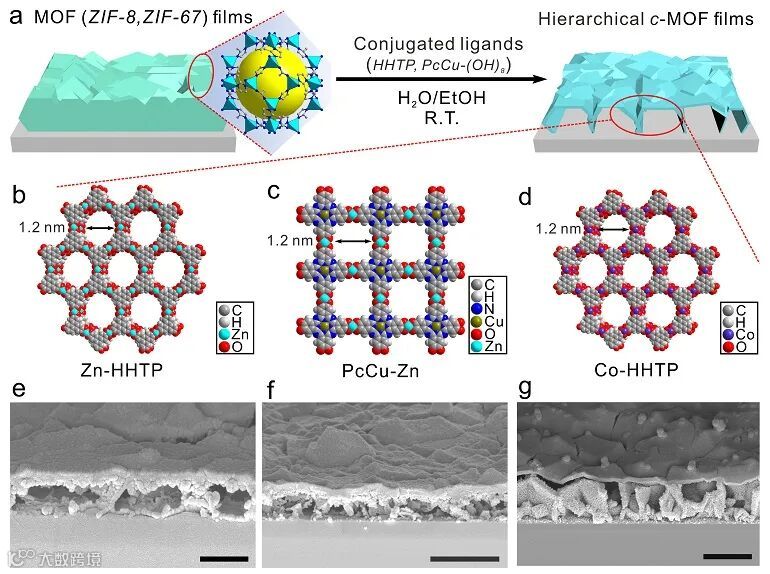 分级空心 c-MOF 薄膜材料是利用三维不导电的 MOF(ZIF-8、ZIF-67)作为前驱体,与π-共轭有机配体(六羟基联苯、八羟基钛菁)室温反应得到的。