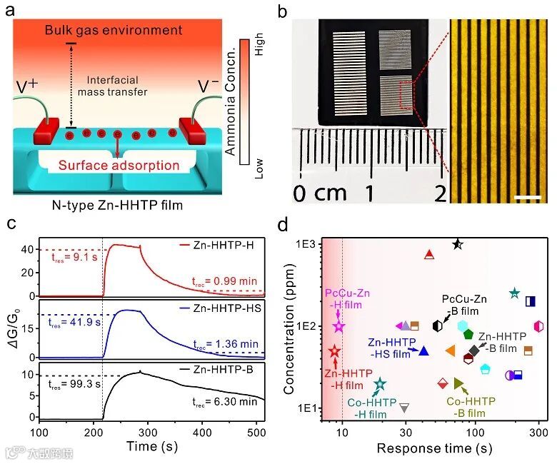 “分级结构加速界面动力学”策略(hierarchical-structure-accelerated interfacial dynamic, HSAID),实现了多孔导电金属有机框架(conductive metal-organic frameworks, c-MOFs)膜材料表面气相物质的快速输运,从而显著提高化学电阻传感器件性能。