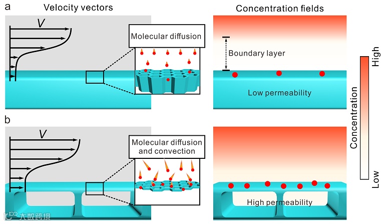 多孔膜材料在自然界和工业生产应用中广泛存在,并起着重要作用。在多孔膜材料参与的诸多异相反应体系中,例如电化学能源存储、异相催化、化学电阻传感等,界面传质(固-液、固-气等)是影响其界面反应动力学的关键因素,但往往受限于缓慢的浓度梯度驱动的分子扩散,导致界面传质效率较低,应用性能远低于理论期望。这主要是因为受到无滑移边界条件影响,流体在多孔材料表面对流