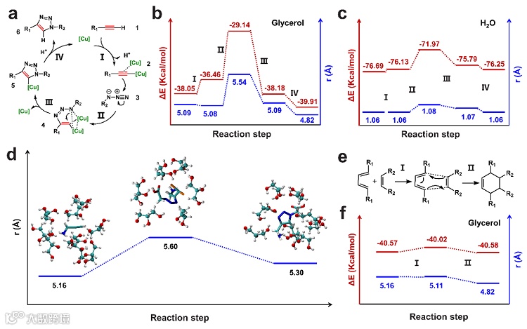 变化引起的(图2)。结合分子动力学模拟与密度泛函理论计算,他们提出了反应过渡态破坏溶液体系的氢键网络促进体系分子扩散增强的猜想。