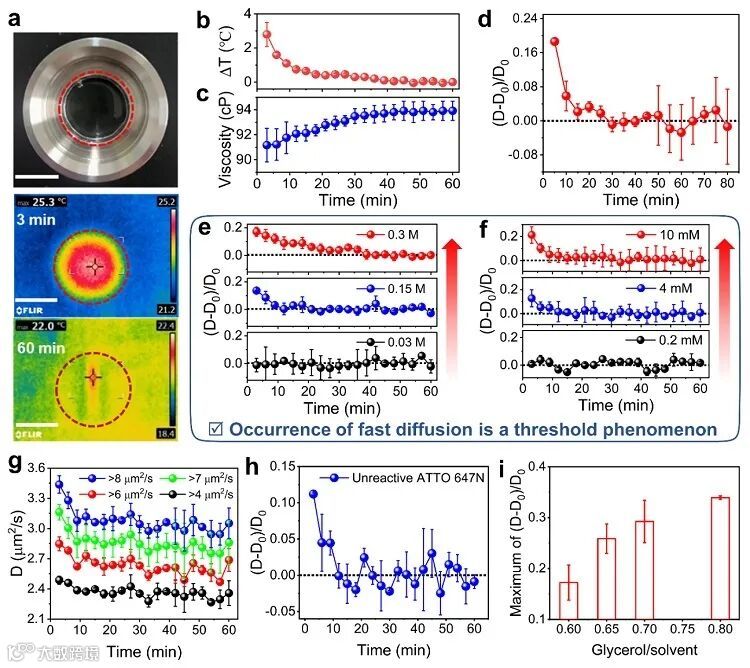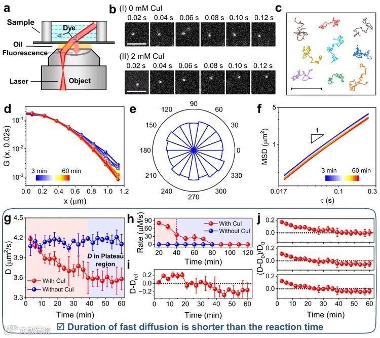为了直接观测反应分子的动力学行为,他们对反应物进行荧光标记,并向反应体系中加入甘油以减慢分子的运动。通过计算粒子轨迹的概率位移分布(DPD)和均方位移(MSD),发现分子扩散增强后仍然表现为布朗运动,同时分析分子运动的转向角发现体系中没有出现对流现象。此外,通过比较分子扩散-