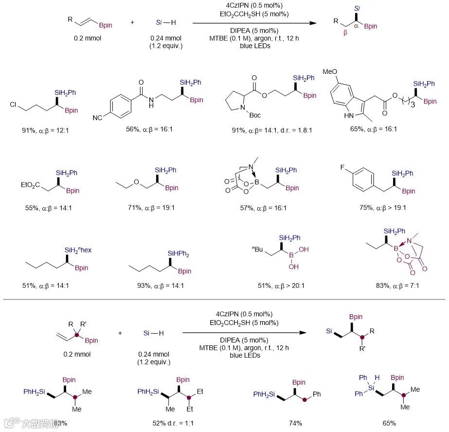 上有利的氢原子转移过程。此外,作者利用1,2-硼迁移的策略实现了烯丙基硼化合物的γ-选择性硅氢化,构建了一系列邻二硅硼化合物(图1D)。这两种方法无需过渡金属,具有广泛的底物适用性,可利用连续流进行放大生产,还可用于多硅硼化合物的合成,具有实用价值。