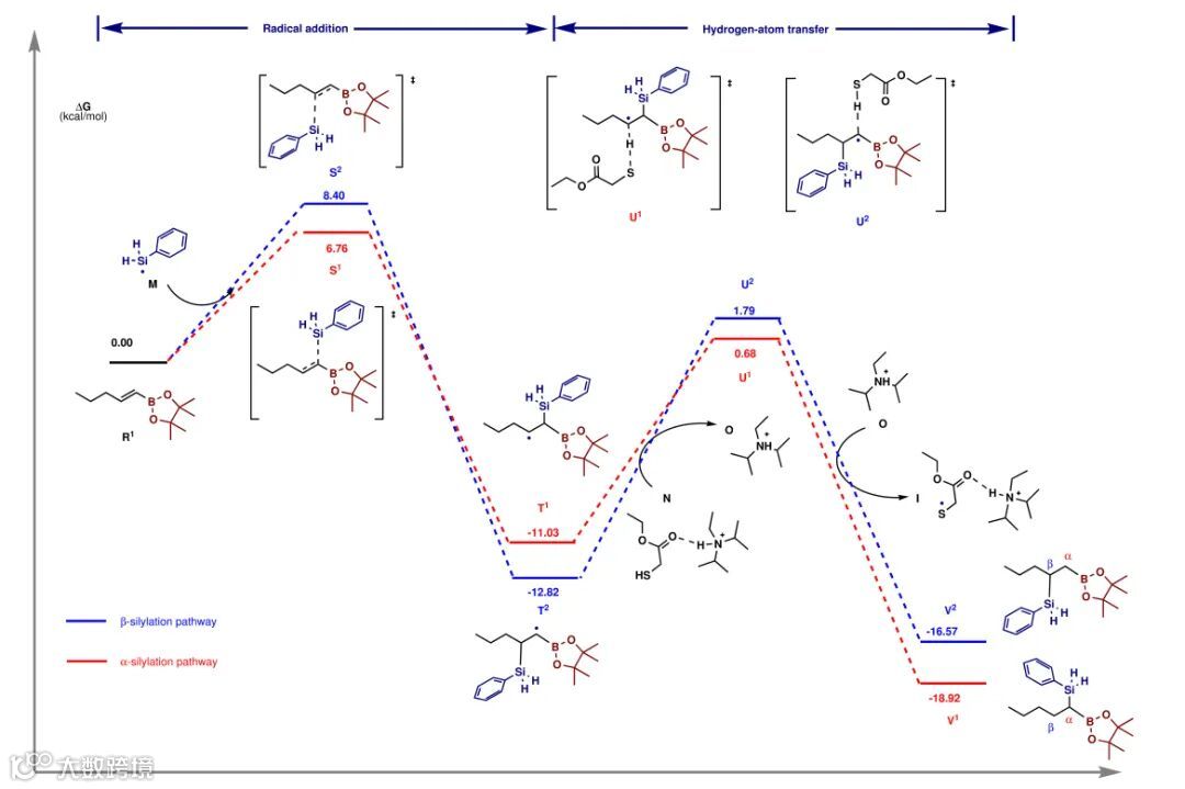 )-1-戊烯基硼酸频哪酯和苯硅烷作为模型,分析了硅自由基加成和后续硫醇参与的氢原子转移过程。计算得到的能量图表明,在硅自由基和烯基硼化合物的加成过程决定了反应的区域选择性,硅基自由基加成在底物α位的能垒比β位(