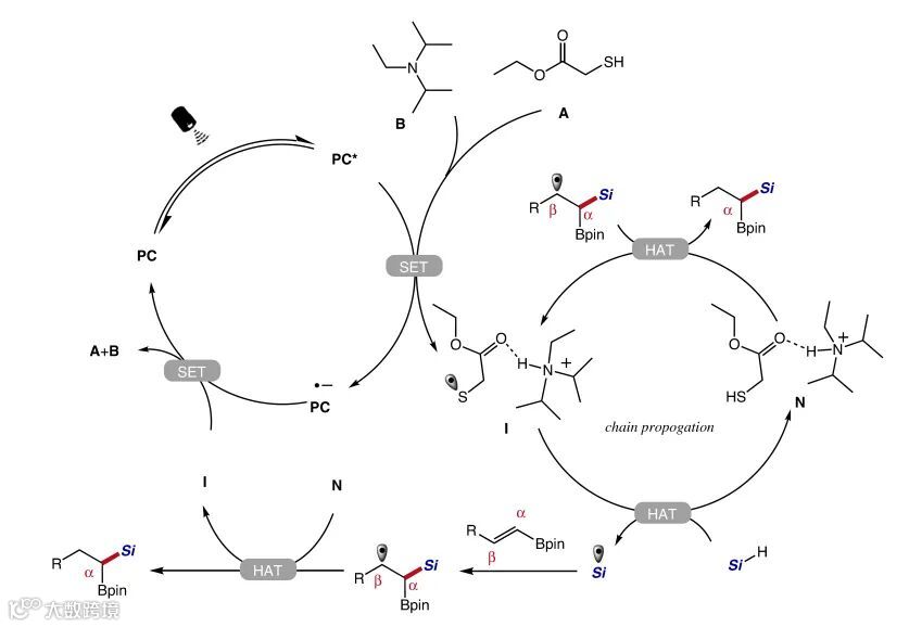 作者进行了一系列的控制实验和计算研究来研究反应机理和区域选择性。自由基捕捉和自由基时钟实验证实该反应为自由基过程。Stern-Volmer荧光猝灭研究表明,激发的光催化剂可以被硫醇和DIPEA的混合物还原猝灭。据此作者提出了烯基硼化合物硅氢化可能的反应机理,激发态的4CzIPN在DIPEA存在下氧化硫醇,循环伏安测试和DFT计算表明形成硫自由基I,继而从硅烷中攫取氢原子生成硅自由基和硫醇N。计算结果表明与DIPEA络合作用稳定了中间体I并促进了从硅烷中攫取氢原子。随后,硅基自由基加成到烯基硼化合物的α位,生成一个烷基自由基中间体,该中间体与硫醇N进行极性匹配的HAT(氢原子转移),最终得到偕二硅硼产物。硫自由基I可以氧化还原的光催化剂4CzIP