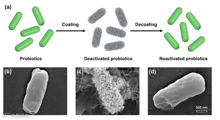 人体胃肠道中的微生物建立了一个复杂但高度有序的生态系统,维持着宿主的生理平衡和机体功能。微生物生态系统的紊乱一般会导致疾病的高发,包括肥胖症、炎症性肠病(IBD)、糖尿病和癌症,严重影响人类健康。基于益生菌的口服疗法是预防和治疗疾病的最有前途的方法之一,递送的益生菌在结肠部位积累,然后通过抑制病原体定植和调节微生物组成从而发挥积极的作用。然而,益生菌在储存期间和通过胃肠道恶劣环境时活力的显著损失,导致低的递送效率,限制了其治疗效果和实际应用。益生菌表面化学修饰和封装是解决其中一些限制的替代策略:如益生菌表面纳米涂覆实现肠道按需释放,但是薄的涂层对胃酸和酶的抗性较低,益生菌的存活率低;另外,现有的封装方法容易在胃肠道中被剪切力或酶分解,导致益生菌的提前释放。上述这些方法提供了暂时的保护和对胃肠道环境的不完全抵抗,导致益生菌疗法在临床研究中的治疗效果不足。