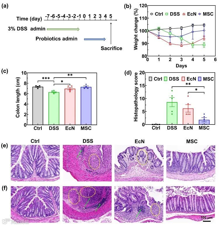 图4. 多壳层胶体囊(MSC)对葡聚糖硫酸钠(DSS)诱导的小鼠结肠炎的治疗;(Ctrl:正常小鼠结肠组织结构,EcN:口服未包封的益生菌后)