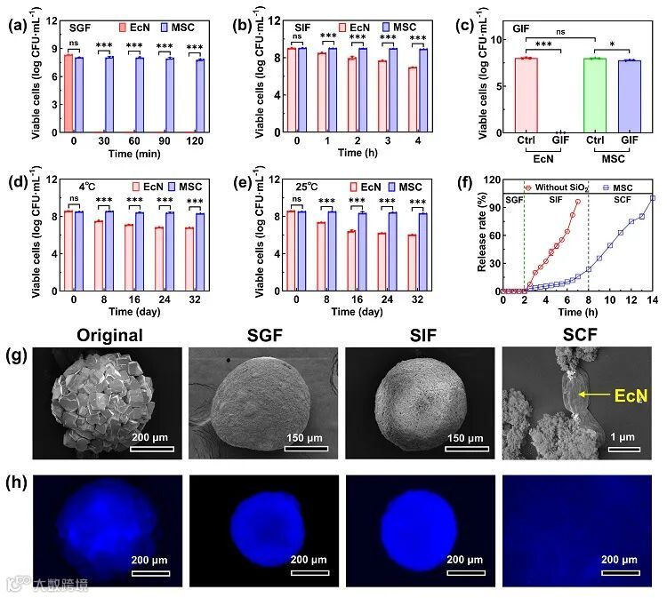 图3. 多壳层胶体囊(MSC)的环境压力抵抗力和结肠释放特性;(EcN:未包封益生菌,SGF:模拟胃液;SIF:模拟肠液;SCF:模拟结肠液;GIF:SGF+SIF)