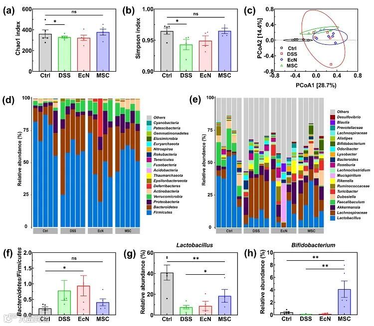 图5. 多壳层胶体囊(MSC)对结肠炎小鼠肠道菌群的调节;(EcN:未包封的益生菌)