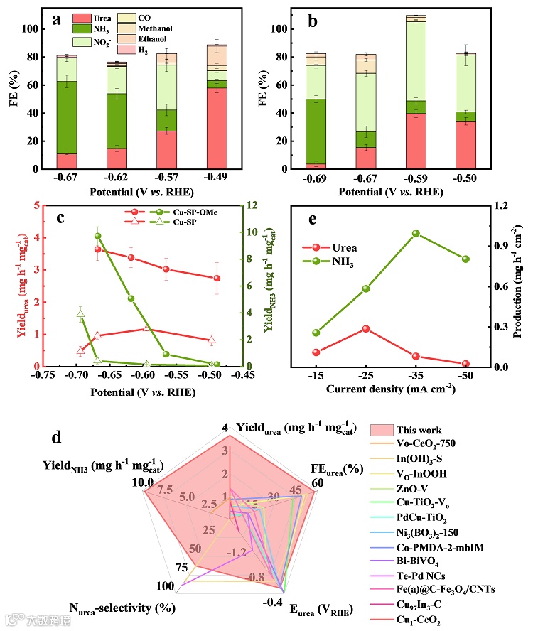 电解液中,Cu-SP-OMe (a)和Cu-SP (b)在不同电位下的产物分布。(c)Cu-SP-OMe和Cu-SP催化剂在不同电位下的尿素和氨的产率。(d)Cu-SP-OMe的