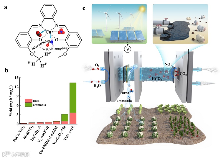 )产率,超越了绝大多数已报道的催化剂。这项研究提供了一种绿色可持续的方法来生产尿素和氨,未来有望与太阳能、风能等可再生能源相结合,将温室气体和废水中硝酸盐转化为有利用价值的产品(图1)。