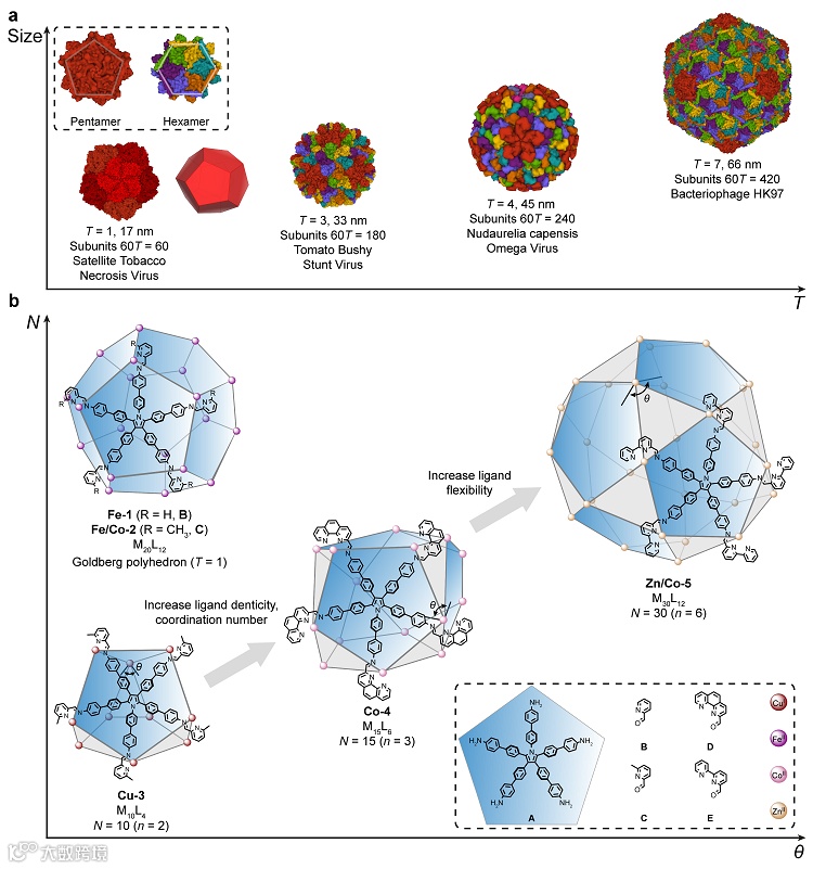 自组装可以从简单基元构建复杂的生物功能性结构,如病毒衣壳和铁蛋白笼,这些笼状结构使用许多相同的亚基铺砌在一个多面体的表面上。大部分球状病毒衣壳由五聚体和六聚体的重复单元自发地自组装而成,衣壳大小可以根据其中装载“货物”的不同而改变。具有Goldberg多面体几何形状及二十面体对称性的衣壳通过在其五边形结构基元之间增加六边形基元,同时保持五边形间的二面角不变来增加其衣壳大小。为了包裹大分子客体或模拟病毒结构,研究者总是期望获得大尺寸、高核数的配位笼,但热力学控制的组装过程具有熵不利的劣势,而且组装过程中纠错的困难会导致分子笼的构筑存在很大的不确定性。由简单基元组成的大尺寸、大空腔配位笼的可控自组装仍然面临着巨大的挑战。