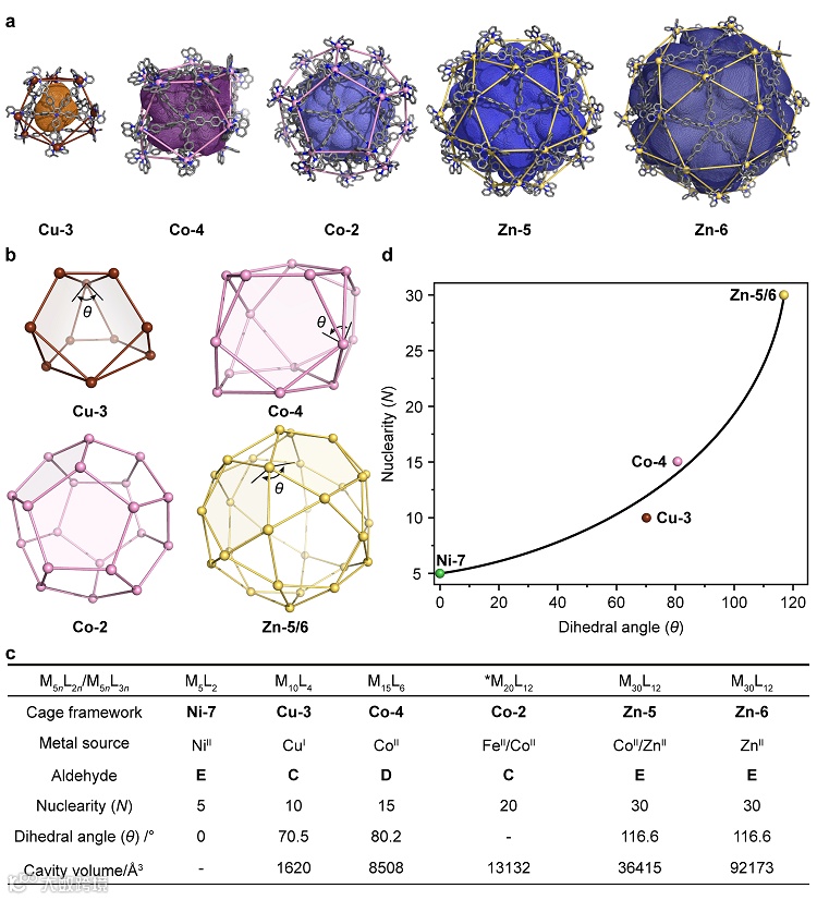 系列分子笼的空腔体积,并在图4a中进行了对比。为了进一步研究导致这些不同结构形成的因素,作者对它们进行了几何分析。如图4d所示,作者计算了每个理想多面体的五边形面之间的二面角