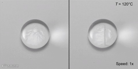 是决定液滴行为的关键因素之一。当表面温度达到一个临界温度,即Leidenfrost温度时,液滴会突然从剧烈沸腾转变为稳定蒸发,这是因为液滴与基底之间形成了一个完整的蒸气膜。由于蒸汽膜的导热性差、摩擦力小,在Leidenfrost状态下,液滴能够稳定存在数分钟且可以近乎“无摩擦”地长距离运动。