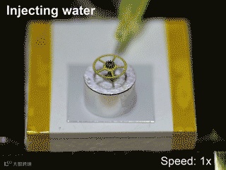 随后,研究者展示了利用“分割Leidenfrost效应”制造的液滴“蒸汽机”(视频3)。他们将齿轮放置在旋转的液滴上,高速转动的液滴能够带动上方的齿轮快速转动。他们发现,加入一个液滴,该“蒸汽机”就能稳定工作四十多秒。而且,高速旋转的液滴能够稳定地输出转动