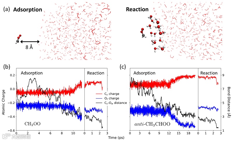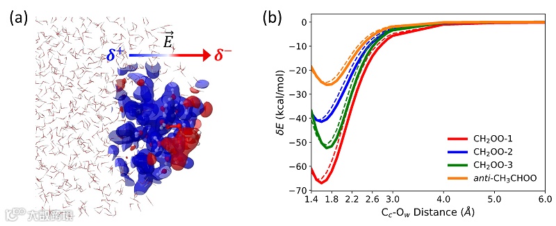 Criegee中间体 (CI) 是重要的羰基氧化物,它可以与许多大气中的化学物发生反应并影响全球气候。CI与水的反应被认为是在对流层消耗CI的主要渠道。以前的实验和计算研究主要集中在CI和水反应的反应动力学过程,然而CI 在水微滴表面 (例如,存在于在气溶胶和云中) 的界面反应活性在分子水平的起源尚不清楚。而最近的研究表明,纯水微滴内不只有是中性的水分子,水分子之间存在持续而短暂的电荷转移,因而产生了部分带电水自由基,可能会与其他化学物质发生反应,或者改变分子的反应活性。目前,实验上已经开始探索利用水微滴表面来进行小规模快速有机合成、纳米结构生长、生物分析等。