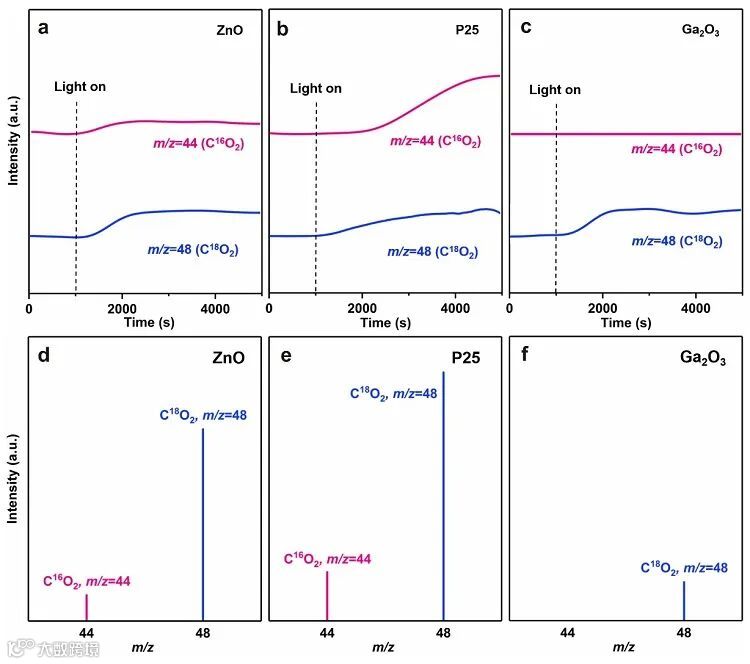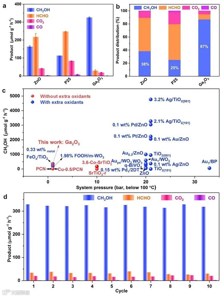 图8. 光催化CH4氧化性能评价:(a)CH3OH、HCHO、CO和CO2产物生成速率图和(b)光照射6小时后BN、ZnO和P25的产物分布(光强度:600 mW/cm2);(c)BN长时间循环CH4光氧化实验(每个循环12小时);(d)与已有报道体系的对比图。