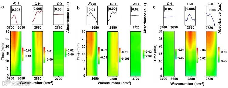 近日,针对太阳能燃料合成过程中目标产物CH3OH的过度氧化问题,西南石油大学周莹教授团队利用自主设计搭建的高时空分辨原位表征装置,成功捕捉到了影响CH3OH过度氧化的关键反应中间体——甲氧基(CH3O*),在国际上首次观察到了CH3O*中C-O化学键断裂产生CH3OH的全过程。在此基础上,明晰了关键反应中间体化学键的选择性断裂对抑制CH3OH过度氧化的作用规律,创新性提出了“氢键陷阱”的策略,实现了反应过程中CH3OH的再生,为抑制烷烃选择性转化领域目标产物的过氧化提供了新的途径。开发的催化剂实现了常温常压无额外氧化剂下甲烷到甲醇的直接转化,CH4转化率3.8%,CH3OH生成速率325.4 μmol g-1 h-1,CH3OH选择性87%,碳平衡88%。以上研究成果近期相继发表于Angewandte Chemie International Edition (文章第一作者为曹玥晗博士和硕士研究生余旺,通讯作者为周莹教授,Angew. Chem. Int. Ed., 2023, DOI: 10.1002/anie.202302196,点击阅读详细)和Journal of the American Chemical Society (文章第一作者为博士研究生韩春秋和曹玥晗博士,通讯作者为周莹教授)。