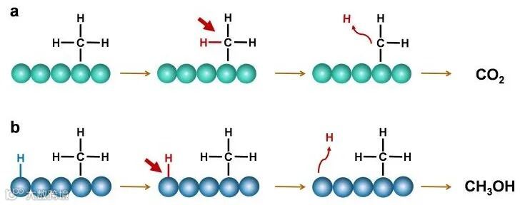 以太阳能、温室气体(甲烷、二氧化碳)和水为原料,通过综合转换系统将可再生能源存储在液体燃料中的技术(太阳能燃料技术),是解决二氧化碳等温室气体排放的根本途径之一,更是将间歇分散的太阳能等可再生能源收集储存的现实储能技术。其中,光催化甲烷直接转化制甲醇反应是实现以上过程的重要基元反应。然而,由于目标产物甲醇易发生过度氧化,该反应一直是科学领域的“圣杯”。其本质原因在于CH4分子会发生连续脱氢过程导致其过氧化为一氧化碳(CO)和二氧化碳(CO2)。因此,如何精准控制CH4分子的脱氢过程来抑制产物的过度氧化在光催化CH4直接转化制CH3OH领域极具挑战。