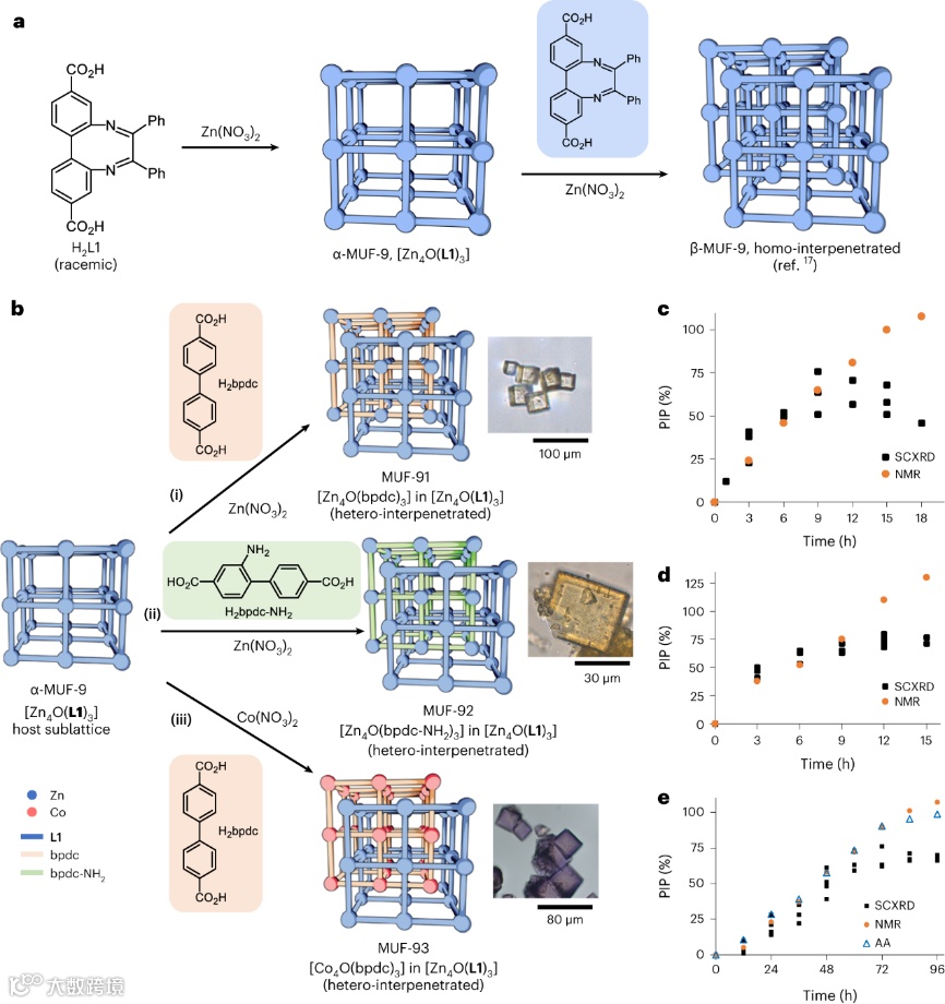 bpdc),制备出MOFs异质互穿结构——MUF-91。同时,他们定义了晶格互穿百分比(PIP),即第二种亚晶格的互穿占有率。经过9小时的反应,PIP达到75%,这是