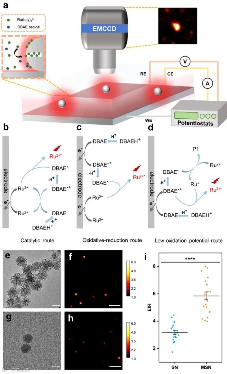 首先,以介孔二氧化硅纳米颗粒为例,可观察到其具有自发增强局域电化学发光强度的能力。随后,通过对其进行表面修饰后,发现粒子增强局域电化学发光强度的能力与其表面电荷存在明显关联,表明其依赖于粒子表面与发光分子间的